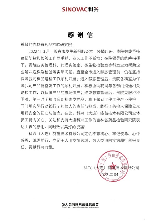 “用实际行动践行了药检人的责任与担当、践行了药检人保障公众用药安全的初心与使命。”这是一封来自科兴(大连)疫苗技术有限公司送给吉林省药品检验研究院感谢信。