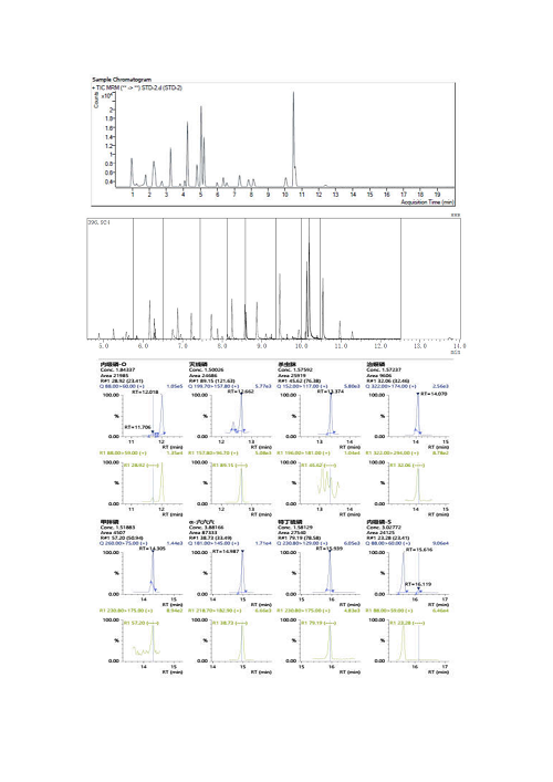 禁用农药等残留量测定为《中国药典》2020年版新增方法,属于痕量分析,检测指标多,检测技术复杂,同时涉及液质联用仪和气质联用仪。检测过程对实验人员能力要求较高,不仅要有扎实的常规检验能力,更要有精细的痕量分析质量保证能力。为确保检验项目取得满意结果,省药检院精心准备,相关科室人员通力协作,通过收集菊花空白基质样品,开展预实验并进行数据分析。同时,检验人员采用不同提取方法进行实验和结果比对,排除基质干扰,并对检测方法及仪器设备进行验证和优化。在时间紧迫并且日常检测任务较为繁重的情况下,按时提交各项检测结果,最终结果均为满意。