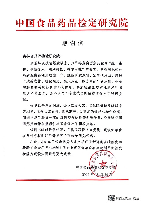 2022年,省院在吉林省药监局的坚强领导和大力支持下,面对疫情对检验工作的严峻考验,根据国家药监局的统筹安排,凝心聚力、勇于担当、攻坚克难,保质保量完成了新冠疫苗的检验任务,对省院的出色工作、重要贡献和省局的坚强领导、大力支持表示感谢。同时,对省院派出优秀人才支援中检院新冠疫苗批签发和检验工作表示感谢。