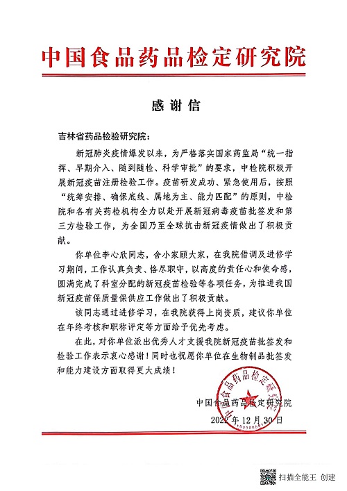 近日,省药品检验研究院收到中国食品药品检定研究院感谢信。信中对省药检院在新冠病毒疫苗检验和签发工作中攻坚克难、同舟共济,为新冠病毒疫苗保质量保供应作出的突出贡献表示衷心感谢,对省院李心欣同志、李搏远同志提出表扬。